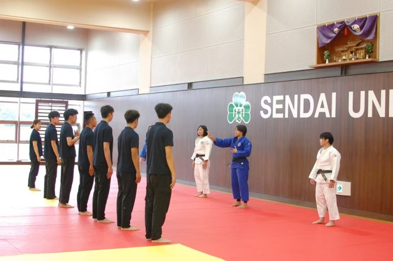 交流团的师生们一道体验了日本仙台大学折纸、柔道等特色课程。在折纸课上,交流团师生们同日本师生探讨了折纸课与其专业的关联性;在柔道课上,日方教练为师生们展示了柔道项目何以“以柔克刚” 的身体哲学。
